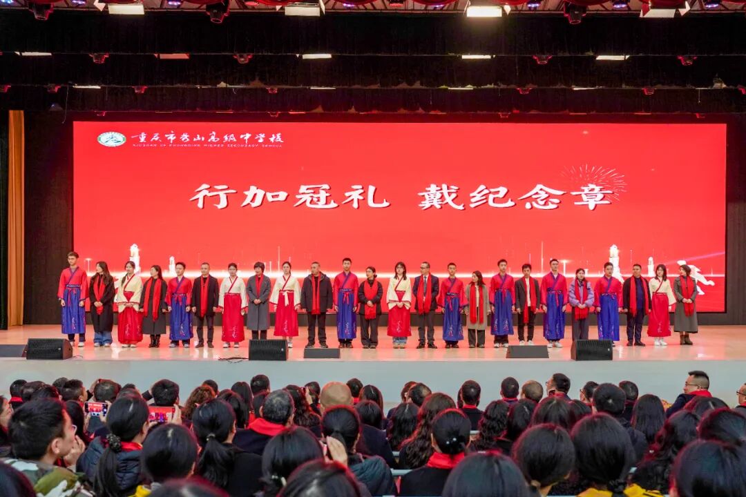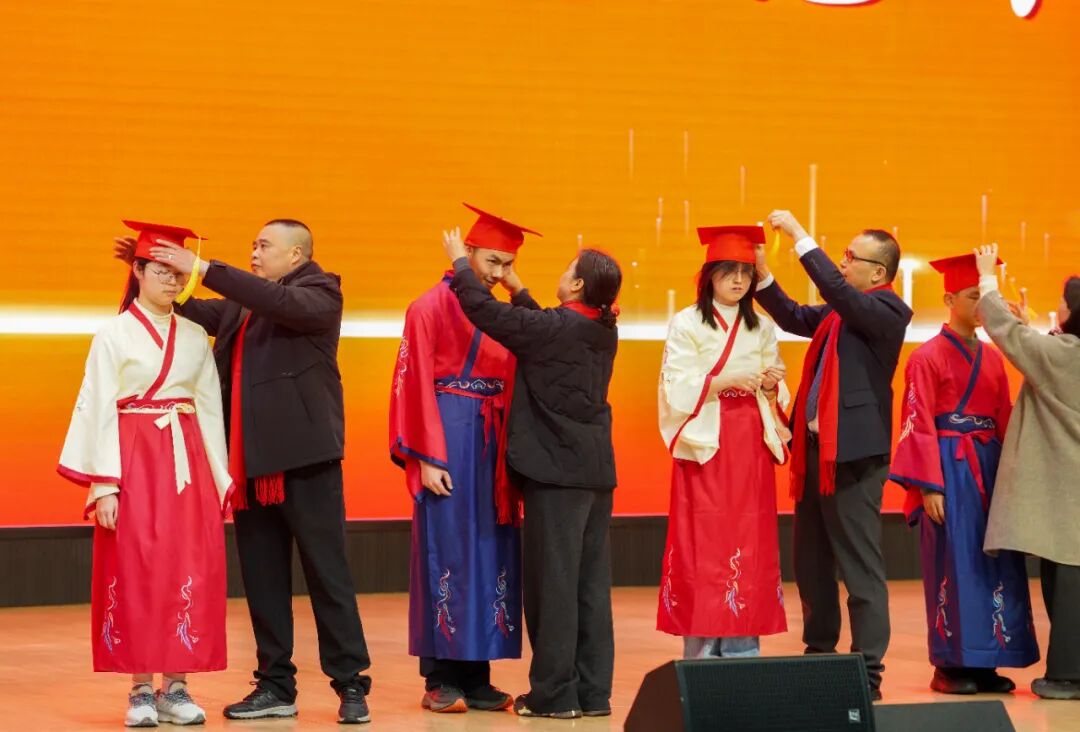 台上,12位家长代表俯身为孩子佩戴礼帽,指尖轻抚帽檐,目光里藏着说不尽的叮咛。台下,同学们互相别上徽章,相视一笑间,是彼此懂得的鼓励。一顶礼帽,接过父母的期许;一枚徽章,别上成人的担当。从此,少年加冠,大任始承。