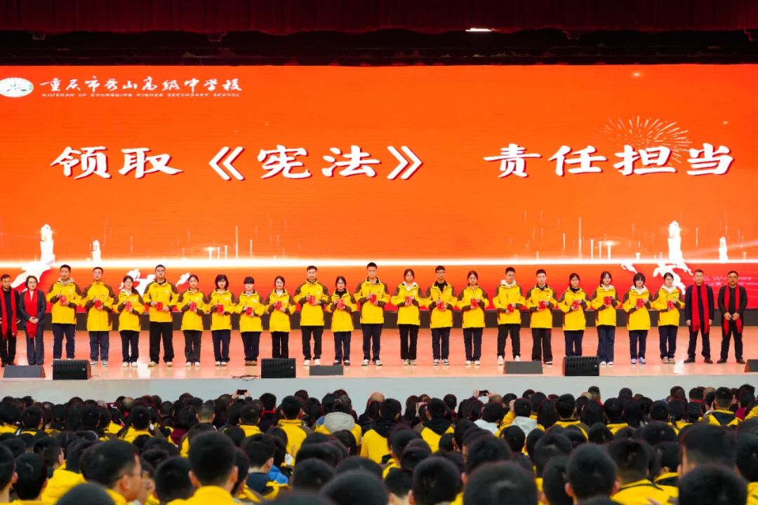 紧接着,各班班长从校领导手中接过《中华人民共和国宪法》。同学们深知:从今天起,既要仰望星空,更要脚踏实地,做一名知法、守法、懂法的新时代好公民。