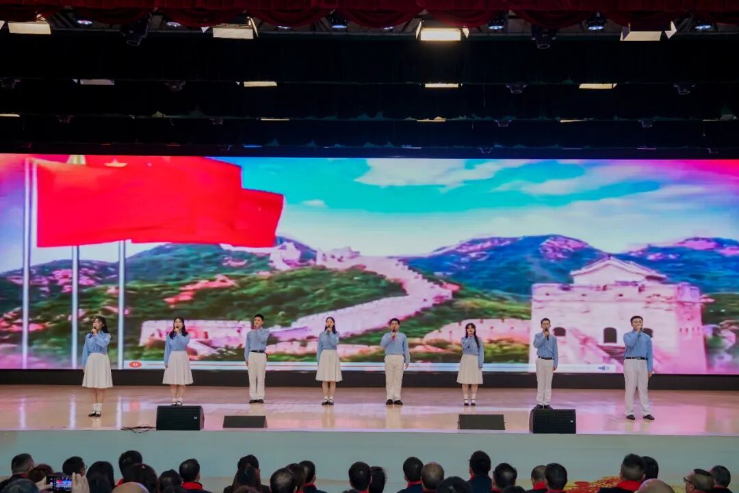 国歌声响,肃立行礼。8位学生代表以《青春中国》朗诵献礼。字里行间,是对过去的感怀,更是对未来的期许。
